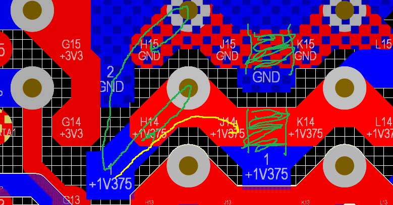 Second, I am assuming that either layer L2 or L3 is GND (near as I can make out).Look at the yellow line starting from H14 again. That is in reality, an alternative path for charge. Ok, that might not be so bad because there is another cap, which shares the via. But, I question the connection of the Poly line that connects the vias. If there is a GND plane then this Poly line connection can be removed and a potentially large return path for charge can be avoided. I have blocked out this section of the Poly with green lines. Again, if there is a GND plane, I think that this connection should be removed.